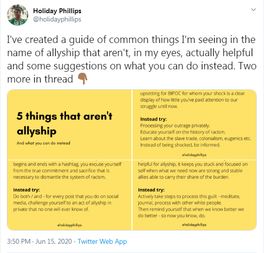 I highly recommend checking out 75 Things White People Can Do For Racial Justice by Corinne Shutack on Medium. Although the political actions are US focused, there were useful recommendations of things to read and watch, as well as suggestions about boycotting certain retailers that fund white supremacist groups or exploit prison labour. Medium itself is a great platform for finding long-reads from a diverse range of authors.