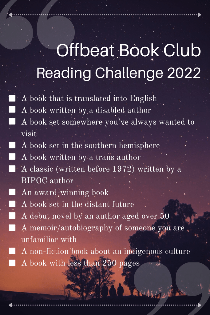 Looking to diversify your reading habits, but can’t commit to book club? This year, why not take part in the Offbeat Book Club reading challenge? Use the categories below to inspire your reading throughout 2022 and let us know how you’re getting on, by tagging us on Instagram or Twitter @offbeatbookclub. You can always ask the Offbeat Book Club community for recommendations!